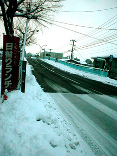 右の写真はアパートの近くの坂道。しょっちゅう工事をしてて渋滞の元となっていたのですが、その工事の成果で、坂の部分だけロードヒーターがきいて雪が積もらないみたい。結構危険な場所だったのでよいことだ。